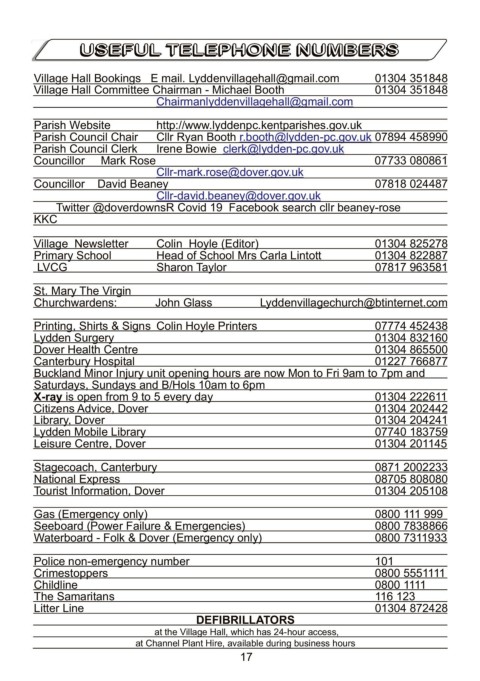 Village Hall Bookings E mail. Lyddenvillagehall@gmail.com 01304 351848